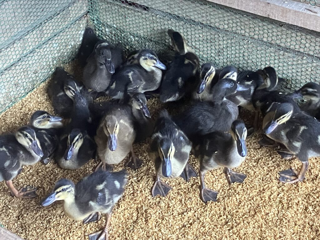 山内さんの倉庫で、数日後に田んぼに放たれることになっている鴨20羽(生後2週間)を見せていただきました。田んぼの周りには、獣から鴨を守るためのネットが張られ、田んぼの一角に鴨の小屋も設置されていました。昨年こなぎが繁茂し、収穫減となったこともあり、山内さんは鴨の投入に踏み切りました。