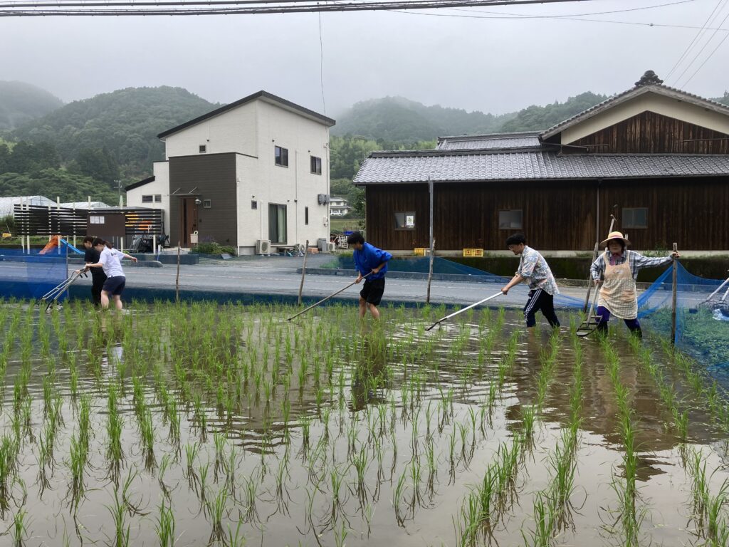 6名参加。田井さんと山内さんの田んぼへ、二手に分かれて田すり(道具を使って草取り)をしました。