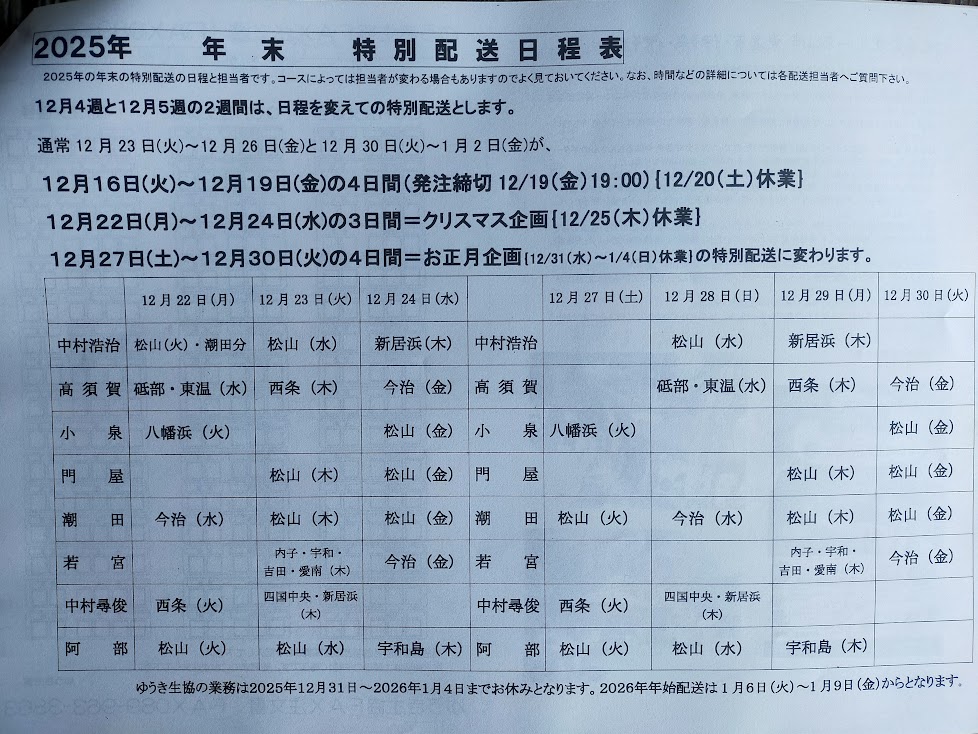 12月も後半に入り、ゆうき生協も年末特別配送期間になりました。
