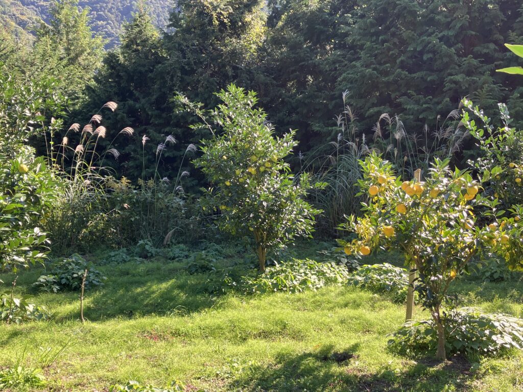 農薬も肥料も使用していません。広い柚子園を丁寧に草刈りされていて(年5回)、刈草に覆われた土は柔らかでした。猪、鹿、野うさぎ対策のため、園の周りには厳重に柵が張り巡らされていました。